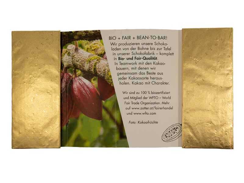Alle Rohstoffe kaufen werden über den fairen Handel und in Bio-Qualität eingekauft und bei Zotter verarbeitet – Bean-to-Bar – von der Bohne bis zur Tafel. Zotter röstet, mahlt, walzt und conchiert mit viel Präzision und entwickelt ganz individuell verarbeitete Schokoladen für Sie.